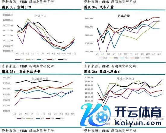 在越过口以及花消品以旧换新计谋提振下,本年以来汽车及家电增速超预期。9月汽车产量同比增长3.6%,1-10月汽车产量累计同比增多1.9%,出口同比增多25.3%。9月空调产量延续大幅增长,同比增多14%,1-10月空调产量累计同比增多8.2%,空调出口同比增多27.2%。据产业在线数据,11月国内空调排产同比增多41.6%,其中内销排产同比增多18.5%,出口排产同比增多65.5%。12月排产同比增多31.7%,其中出口增多48.5%,内销同比增多15%。1-9月集成电路产量同比增多24.8%,出口同比增多11.3%。