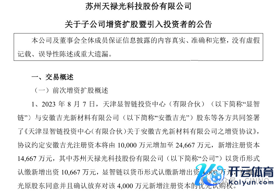 2023 年 8 月 7 日,天津显智链投资中心(有限合股)(以下简称“显智链”)与安徽吉光新材料有限公司(以下简称“安徽吉光”)鼓动等各方共同签署了《天津显智链投资中心(有限合股)对于安徽吉光新材料有限公司之增资公约》,公约商定安徽吉光注册成本将由10,000万元加多至24,667万元,新增注册成本14,667 万元,其中苏州天禄光科技股份有限公司(以下简称“公司”)以货币阵势认缴新增出资10,667万元,显智链以货币阵势认缴新增出资4,000万元,安徽吉光原鼓动甘心况且证明废弃对该4,000万元新增注册成本的优先认购权。